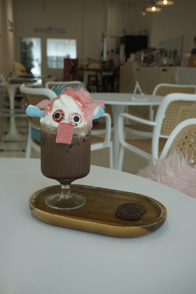 To wash it all down, we tried the Iced Monster Chocolate Drink. A thick chocolate blend topped with an Oreo, which we dunked before eating. It was messy, fun, and exactly what a monster-themed drink should be.