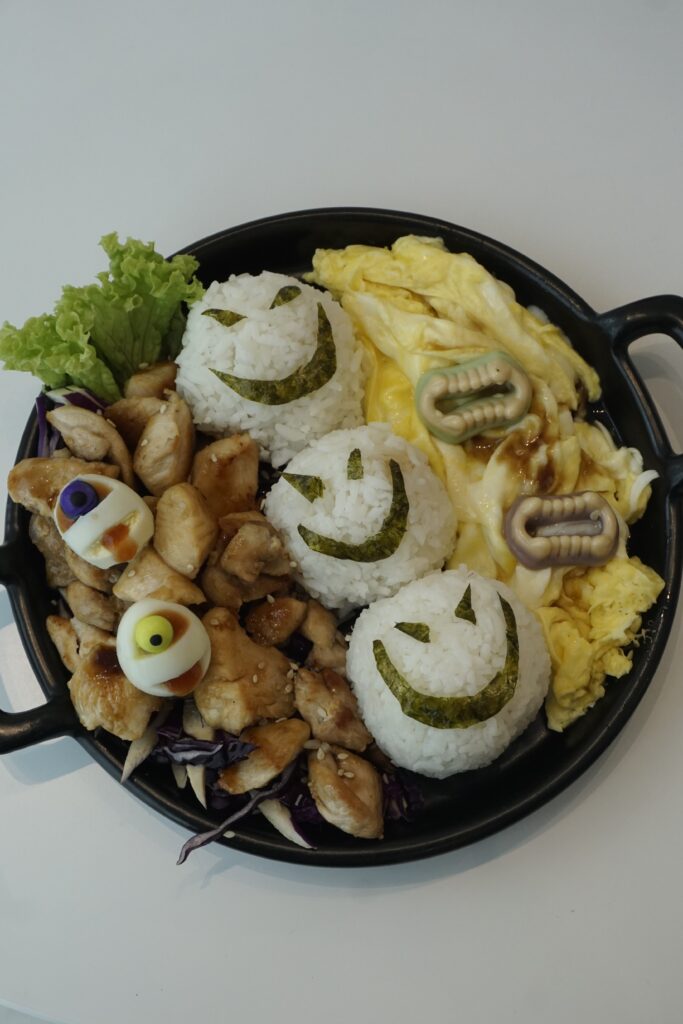 The first dish that landed on our table was the Creepy Teriyaki Chicken Rice. At first glance, it looked innocent enough – until you noticed the tooth candy grinning back at you from the scrambled eggs. To add to the madness, little quail eggs were perched right on top, making the plate look both playful and chilling.