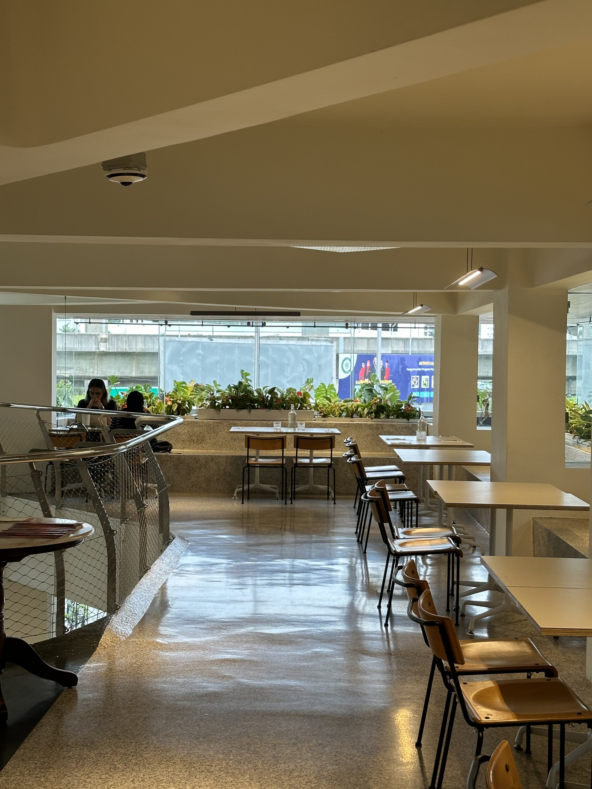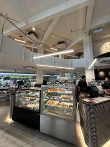 The café’s open design is further enhanced by its glass walls, which flood the space with natural light throughout the day. This bright and airy layout makes the café feel spacious and modern, creating a comfortable environment for customers to relax and enjoy their meals. The welcoming atmosphere encourages guests to linger, making it an ideal spot for both casual dining and quiet moments.